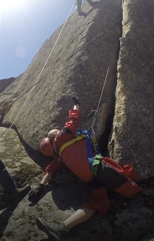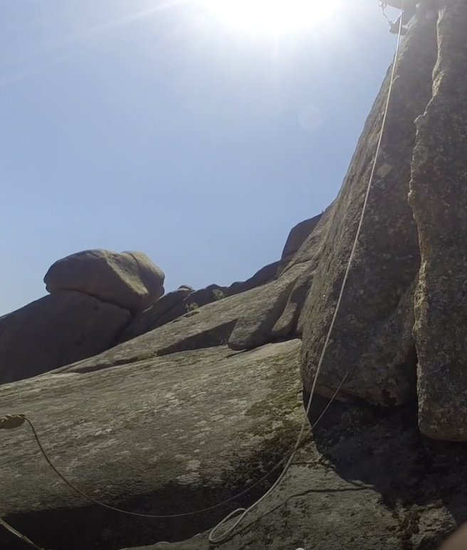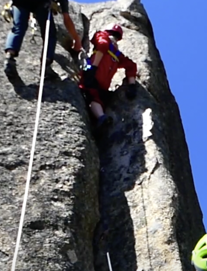 Pero sobre todo me llama la atención que el punto de encordamiento está a la altura del pecho y no en la cintura. Parece que el muñeco llevaba un arnés de pecho. Eso afectaría enormemente al resultado. A la distancia que se queda el muñeco del suelo, que se puede ver que es mínima, con un encordamiento en la cintura, por la inercia, estoy seguro de que el muñeco habría volteado y golpeado con la cabeza y la parte superior la espalda. No entiendo el uso de este encordamiento de pecho para la simulación, cuando ambos escalábamos con arneses de cintura.