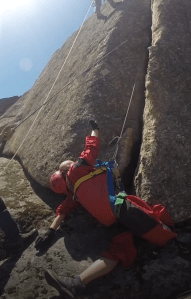 Recuerdo perfectamente la posición en la que se quedó mi compañero porque, como ya he contado, estuve ahí un buen rato tratando de reanimarlo y hablando con el 112. Su postura era bastante diferente, con las piernas contra la pared y el cuerpo hacia atrás a favor de la pendiente mirando hacia arriba. De hecho las piernas las tenía dobladas contra la pared casi metido en la fisura. Imagino que esa postura tan incómoda era una de las razones por las que insistía en moverse.